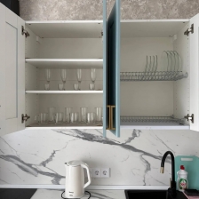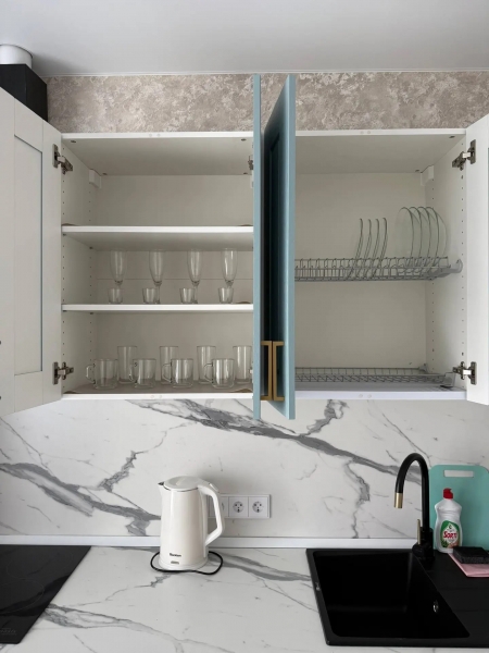 Кухня оснащена всеми необходимыми бытовыми приборами (холодильник, микроволновка, электрический чайник, духовка) и столовыми принадлежностями (кастрюли, сковорода, кружки, тарелки, столовые приборы).