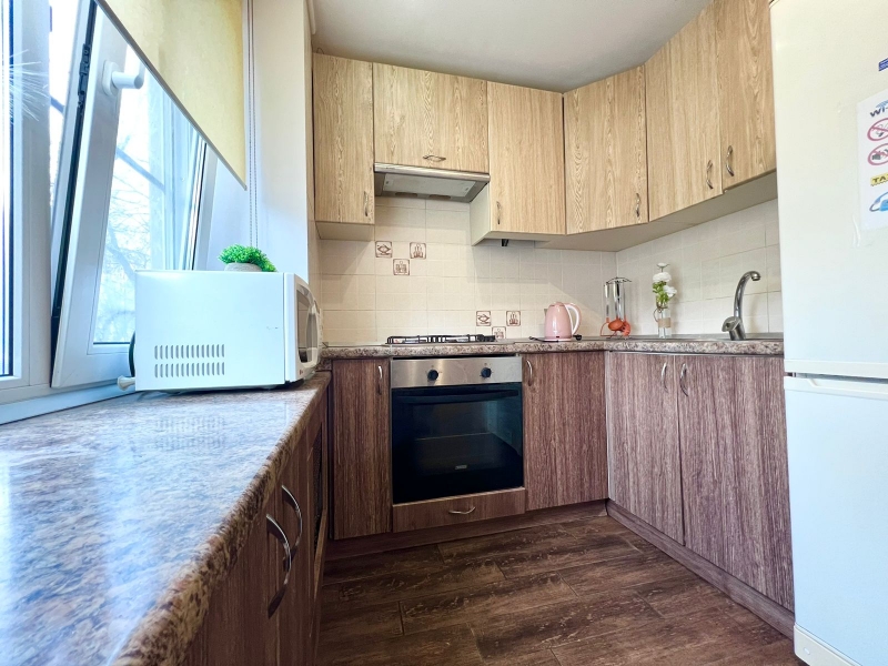 Кухня оснащена всеми необходимыми бытовыми приборами (холодильник, микроволновка, электрический чайник) и столовыми принадлежностями (кастрюли, сковорода, кружки, тарелки, столовые приборы).