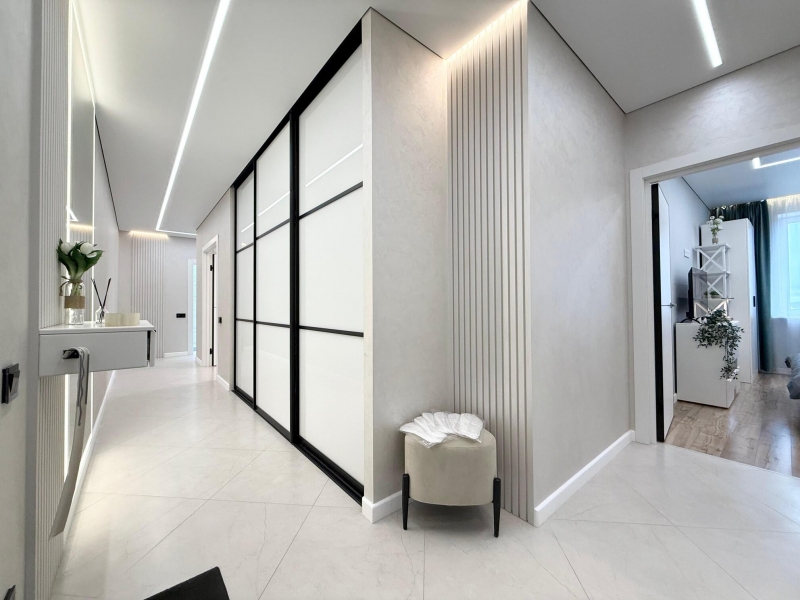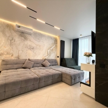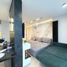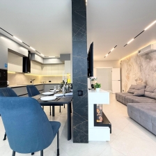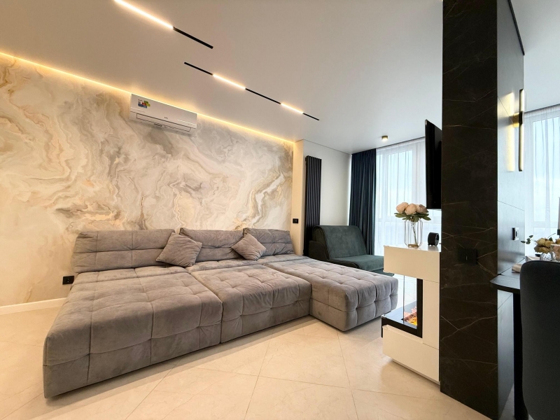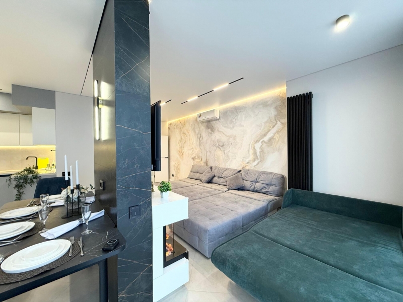 Комфортабельная 2 -ух комнатная квартира с большой кухней-гостиной, панорамными окнами и камином в новом доме, с евро ремонтом и стильным дизайном.