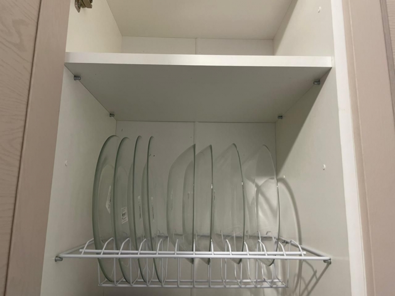 Кухня оснащена всеми необходимыми бытовыми приборами (холодильник, микроволновка, электрический чайник) и столовыми принадлежностями (кастрюли, сковорода, кружки, тарелки, столовые приборы).