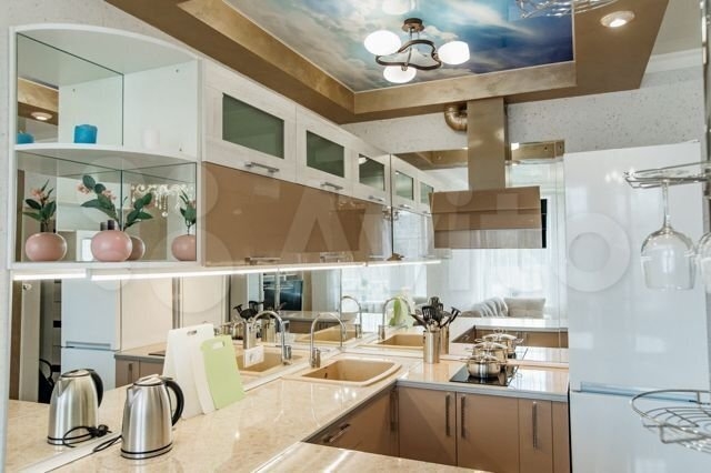 Кухня оснащена всеми необходимыми бытовыми приборами (холодильник, микроволновка, электрический чайник, духовка) и столовыми принадлежностями (кастрюли, сковорода, кружки, тарелки, столовые приборы).