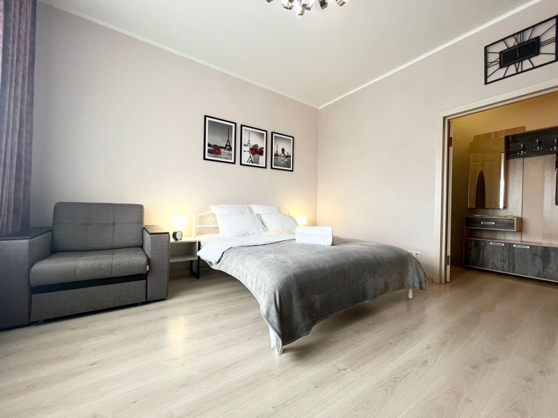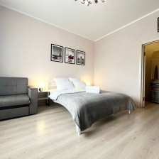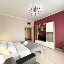 В квартире современная мебель, новая сантехника, натяжные потолки, стеклопакеты, хорошая шумоизоляция,фен, утюг, гладильная доска, сушилка для белья, стиральная машина. Есть все необходимое для проживания. Предусмотрено размещение до 3-х человек, Двуспальная кровать и кресло-кровать.