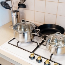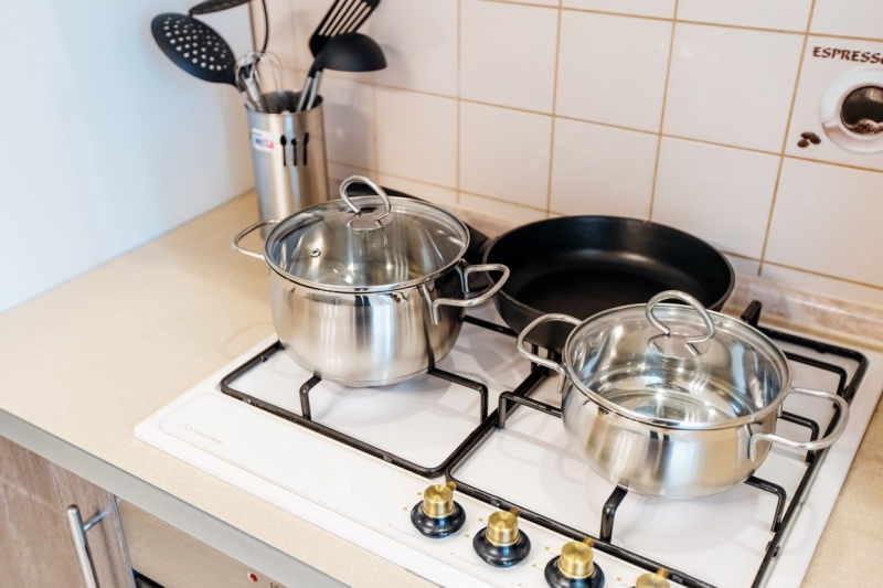 Кухня оснащена всеми необходимыми бытовыми приборами (холодильник, микроволновка, электрический чайник, духовка) и столовыми принадлежностями (кастрюли, сковорода, кружки, тарелки, столовые приборы).