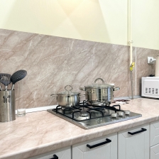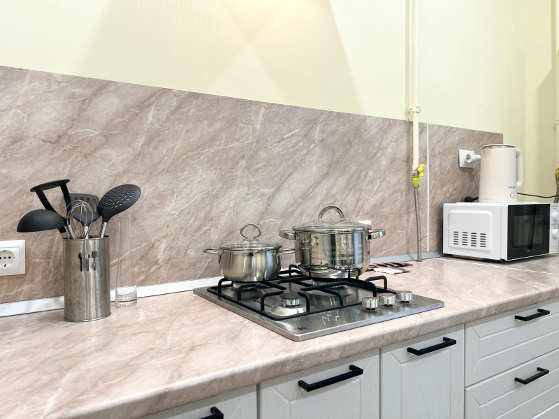 Кухня оснащена всеми необходимыми бытовыми приборами (холодильник, микроволновка, электрический чайник) и столовыми принадлежностями (кастрюли, сковорода, кружки, тарелки, столовые приборы).