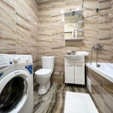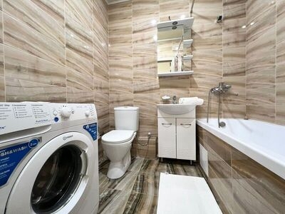 Просторная ванная комната, стиральная машина.