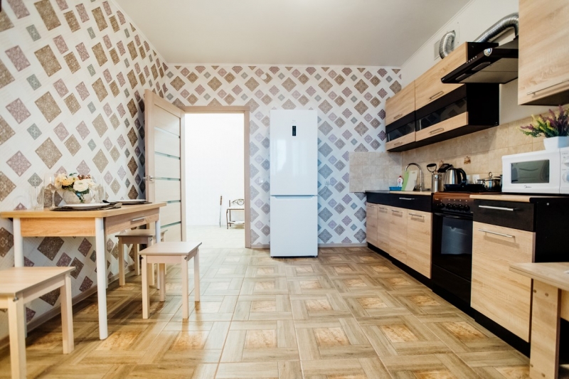Кухня оснащена всеми необходимыми бытовыми приборами (холодильник, микроволновка, электрический чайник) и столовыми принадлежностями (кастрюли, сковорода, кружки, тарелки, столовые приборы).