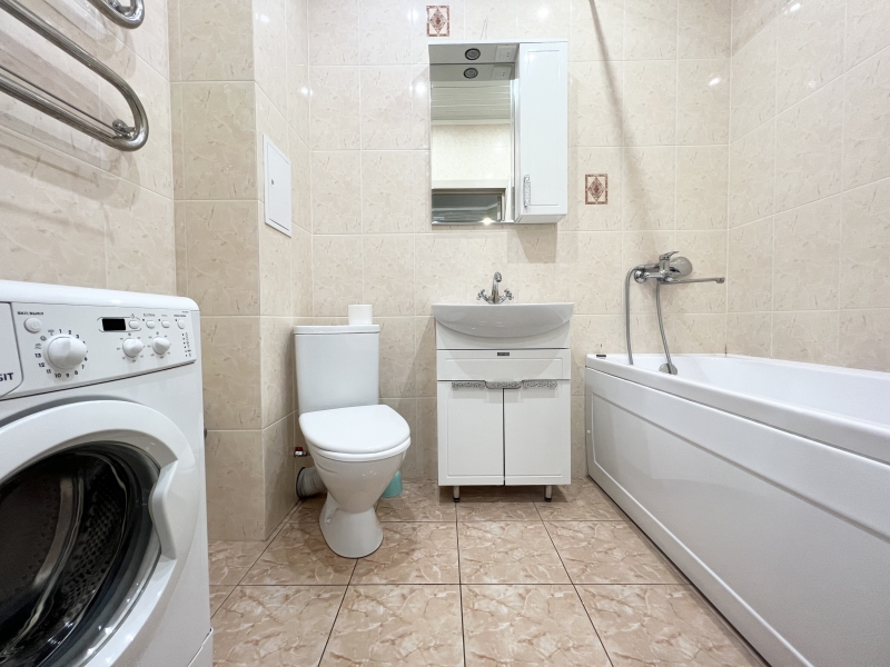 В квартире современная мебель, новая сантехника, натяжные потолки, стеклопакеты, хорошая шумоизоляция,фен, утюг, гладильная доска, сушилка для белья, стиральная машина. Есть все необходимое для проживания.