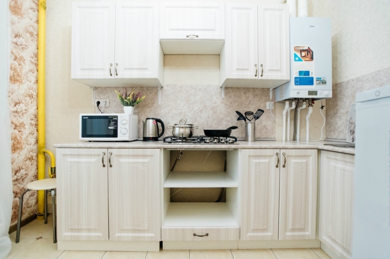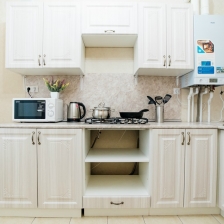 Кухня оснащена всеми необходимыми бытовыми приборами (холодильник, микроволновка, электрический чайник) и столовыми принадлежностями (кастрюли, сковорода, кружки, тарелки, столовые приборы).