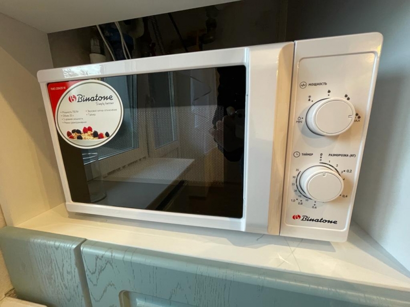 Кухня оснащена всеми необходимыми бытовыми приборами (холодильник, микроволновка, электрический чайник) и столовыми принадлежностями (кастрюли, сковорода, кружки, тарелки, столовые приборы).