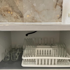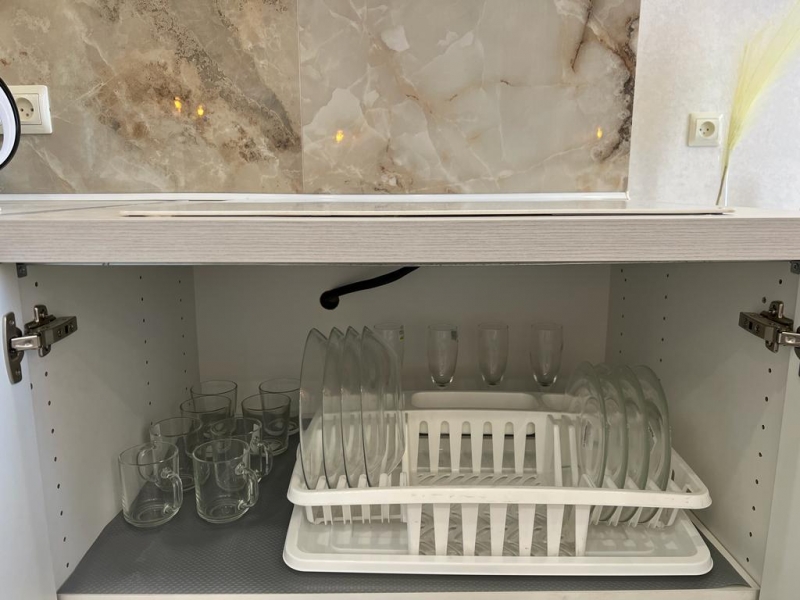 Кухня оснащена всеми необходимыми бытовыми приборами (холодильник, микроволновка, электрический чайник) и столовыми принадлежностями (кастрюли, сковорода, кружки, тарелки, столовые приборы).