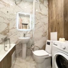 В квартире современная мебель, новая сантехника, натяжные потолки, стеклопакеты, хорошая шумоизоляция, фен, утюг, гладильная доска, сушилка для белья, стиральная машина. Есть все необходимое для проживания.