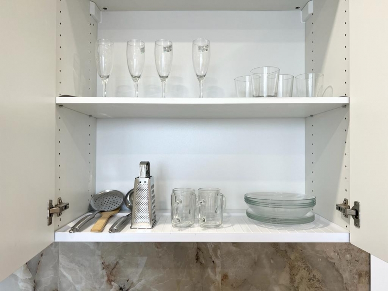 Кухня оснащена всеми необходимыми бытовыми приборами (холодильник, микроволновка, электрический чайник) и столовыми принадлежностями (кастрюли, сковорода, кружки, тарелки, столовые приборы).