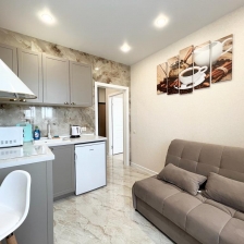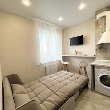 В квартире современная мебель, новая сантехника, натяжные потолки, стеклопакеты, хорошая шумоизоляция, фен, утюг, гладильная доска, сушилка для белья, стиральная машина. Есть все необходимое для проживания.