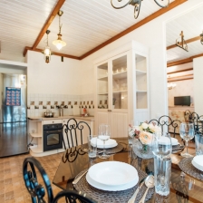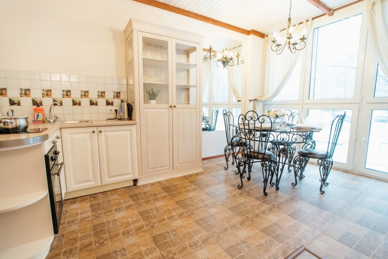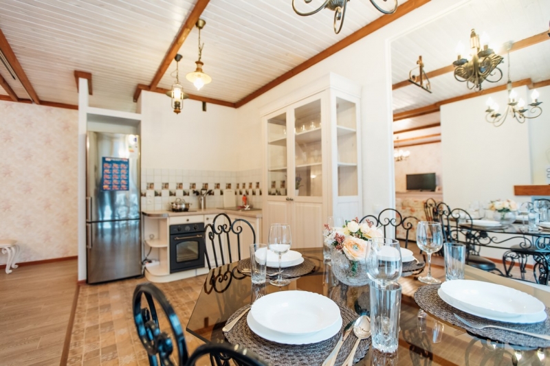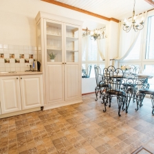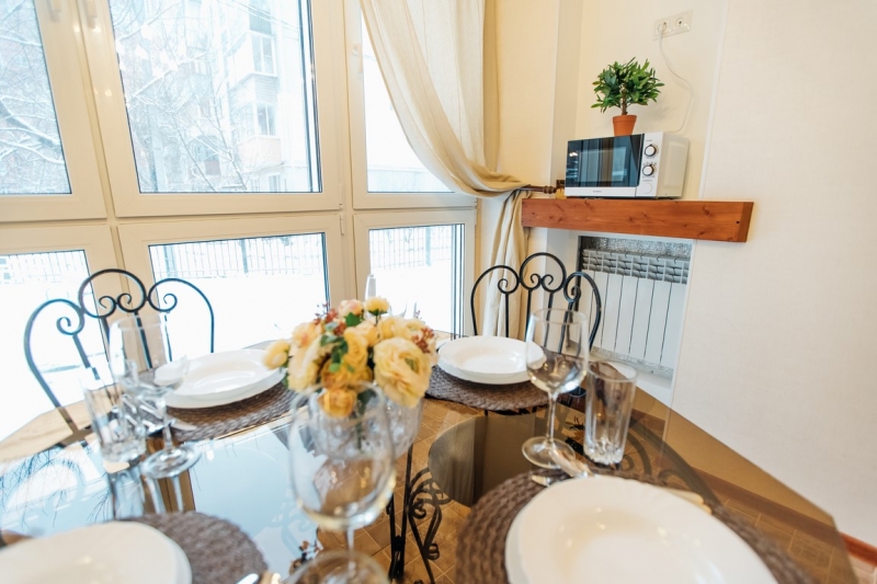 Кухня оснащена всеми необходимыми бытовыми приборами (холодильник, микроволновка, электрический чайник) и столовыми принадлежностями (кастрюли, сковорода, кружки, тарелки, столовые приборы).
