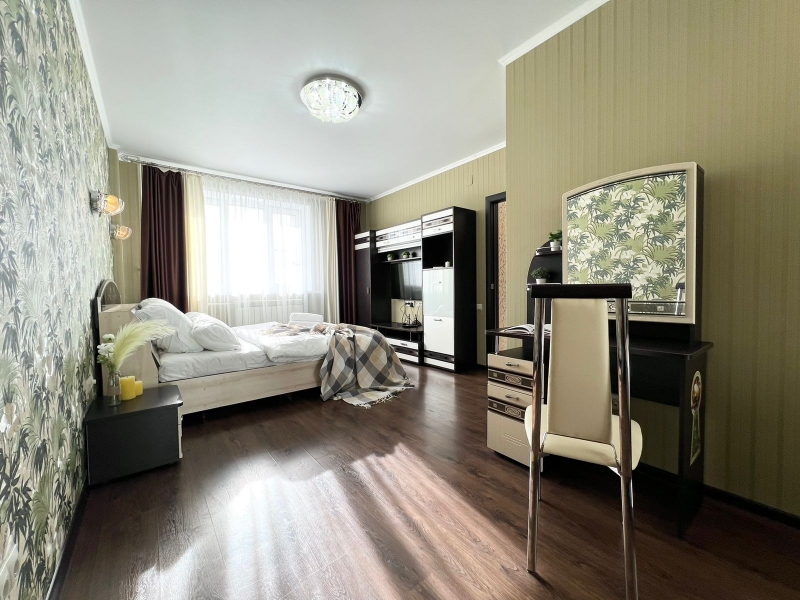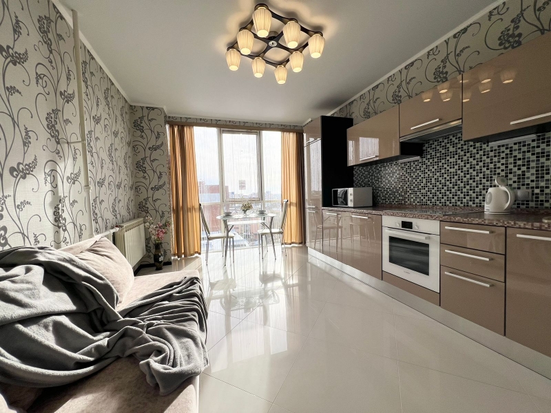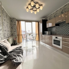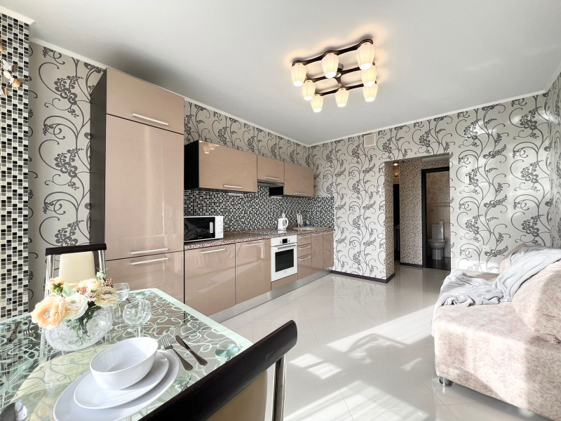 В квартире современная мебель, новая сантехника, натяжные потолки, стеклопакеты, хорошая шумоизоляция, панорамное окно в пол, кондиционер, фен, утюг, гладильная доска, сушилка для белья, стиральная машина. Есть все необходимое для проживания. В Вашем распоряжении: большая двуспальная кровать и двуспальный диван.