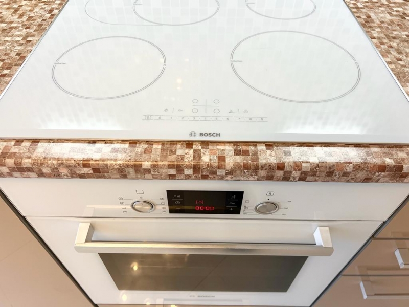 Кухня оснащена всеми необходимыми бытовыми приборами (холодильник, микроволновка, электрический чайник, духовка) и столовыми принадлежностями (кастрюли, сковорода, кружки, тарелки, столовые приборы).