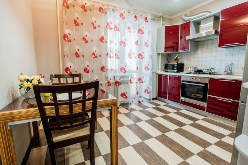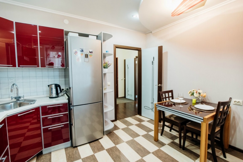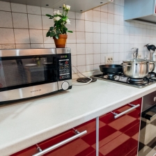 Кухня оснащена всеми необходимыми бытовыми приборами (холодильник, микроволновка, электрический чайник, духовка) и столовыми принадлежностями (кастрюли, сковорода, кружки, тарелки, столовые приборы).