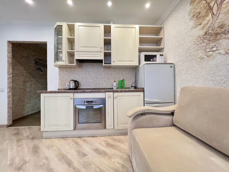 Кухонная зона оснащена всеми необходимыми бытовыми приборами (холодильник, микроволновка, электрический чайник, духовка) и столовыми принадлежностями (кастрюли, сковорода, кружки, тарелки, столовые приборы).