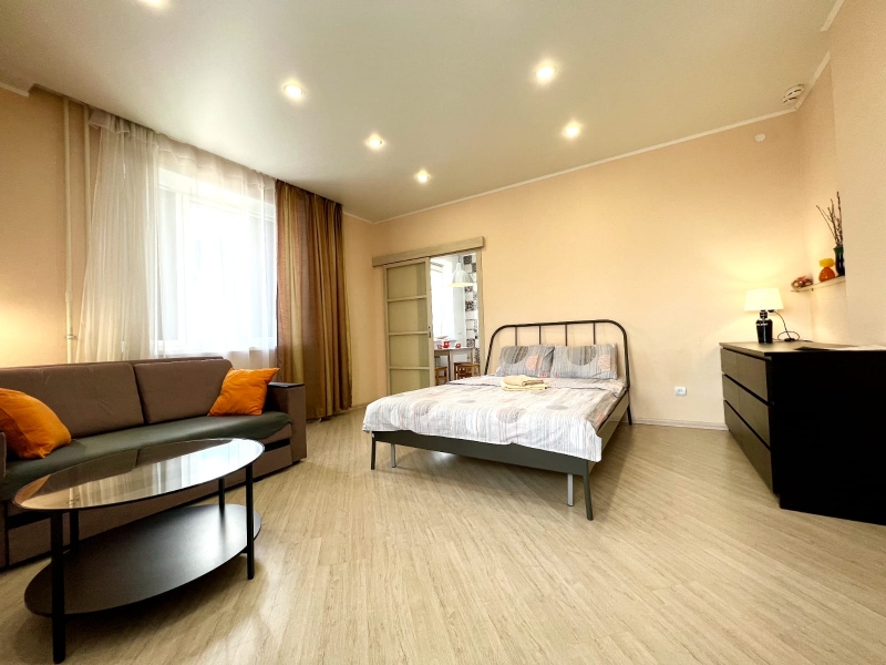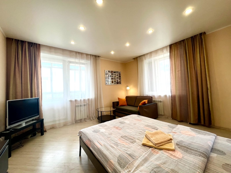 Современная мебель, новая сантехника, натяжные потолки, хорошая шумоизоляция, утюг, гладильная доска, сушилка для белья. Есть все необходимое для проживания. В комнате находится двуспальная кровать с ортопедическим матрасом, шкаф, двуспальный диван, ЖК-телевизор.